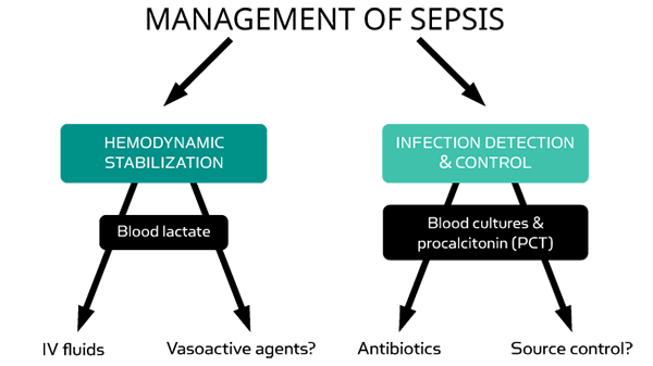 PCT- en lactaatmetingen zijn handige hulpmiddelen om sepsis vast te stellen en te beheersen. Ze vullen de algemene klinische beoordeling van de lichamelijke conditie van de patiënt aan [3].