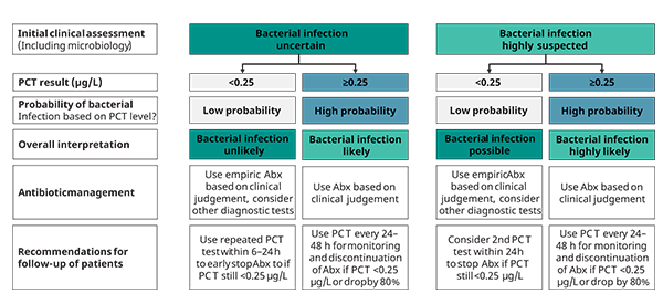 Het toepassen van PCT wordt beschreven in de richtlijnen van de Surviving Sepsis Campaign [9], met de aanbeveling dat PCT kan worden gebruikt voor antimicrobieel beheer. Het zou raadzaam zijn om PCT te meten in de diagnostische fase van sepsis, om een initiële basis-PCT-waarde te hebben, voordat antibiotica worden toegediend [11].