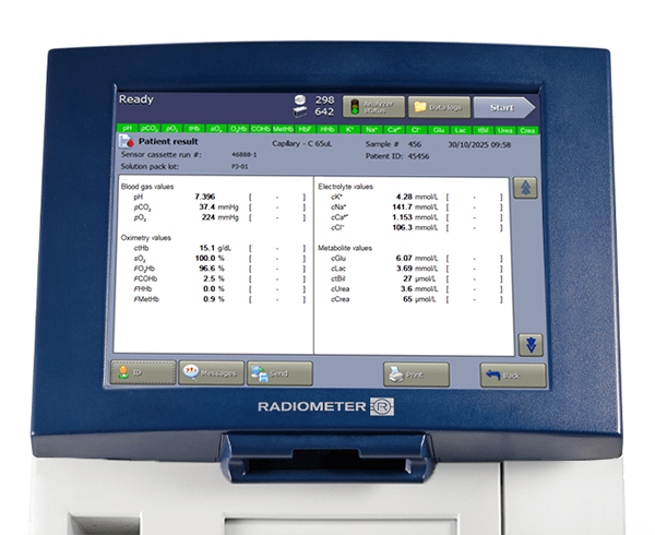 Met de ABL90 FLEX PLUS-bloedgasanalyser kunt u kreatinine, ureum en eGFR aan uw bloedgaspanel toevoegen. Met slechts 65 μl volbloed krijgt u in 35 seconden 19 resultaten.