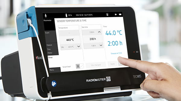 De Radiometer TCM5 FLEX transcutane monitor helpt de ongemakken voor de patiënt te beperken met door het systeem vastgestelde tijdslimieten van de meetplek ten opzichte van de temperatuur om het risico van schade door de verwarmde sensor te verminderen via vooraf ingestelde combinatie van tijd en temperatuur.